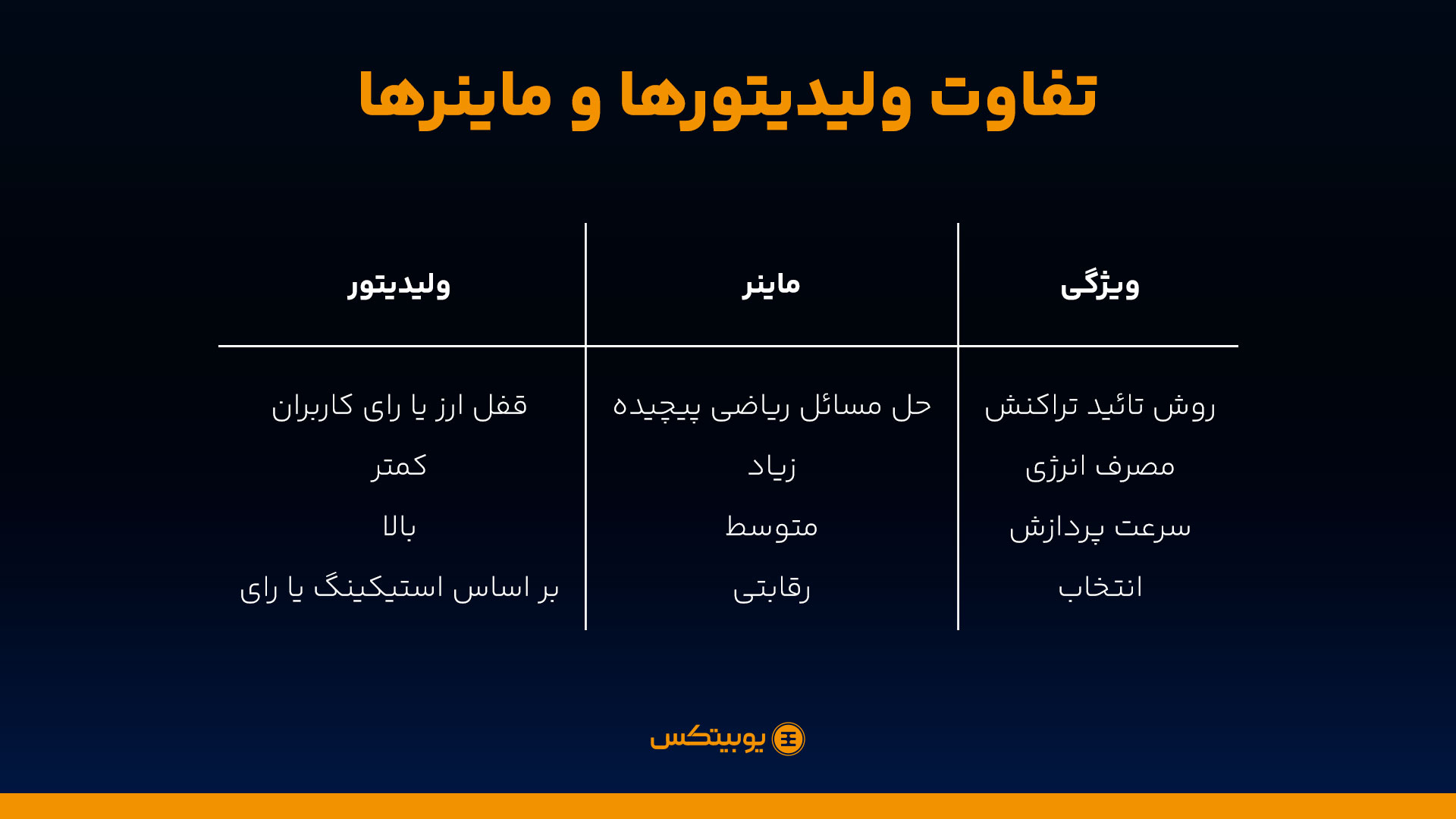 ولیدیتورها: در شبکههای PoS براساس میزان ارز قفلشده انتخاب میشوند و مصرف انرژی کمتری دارند.